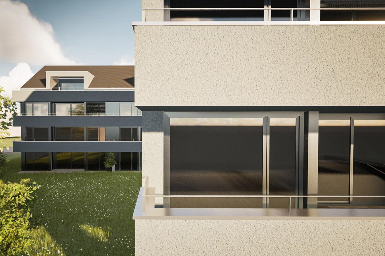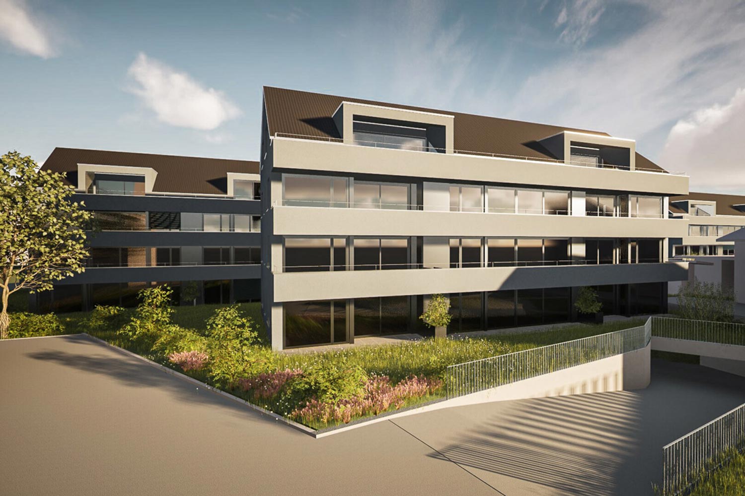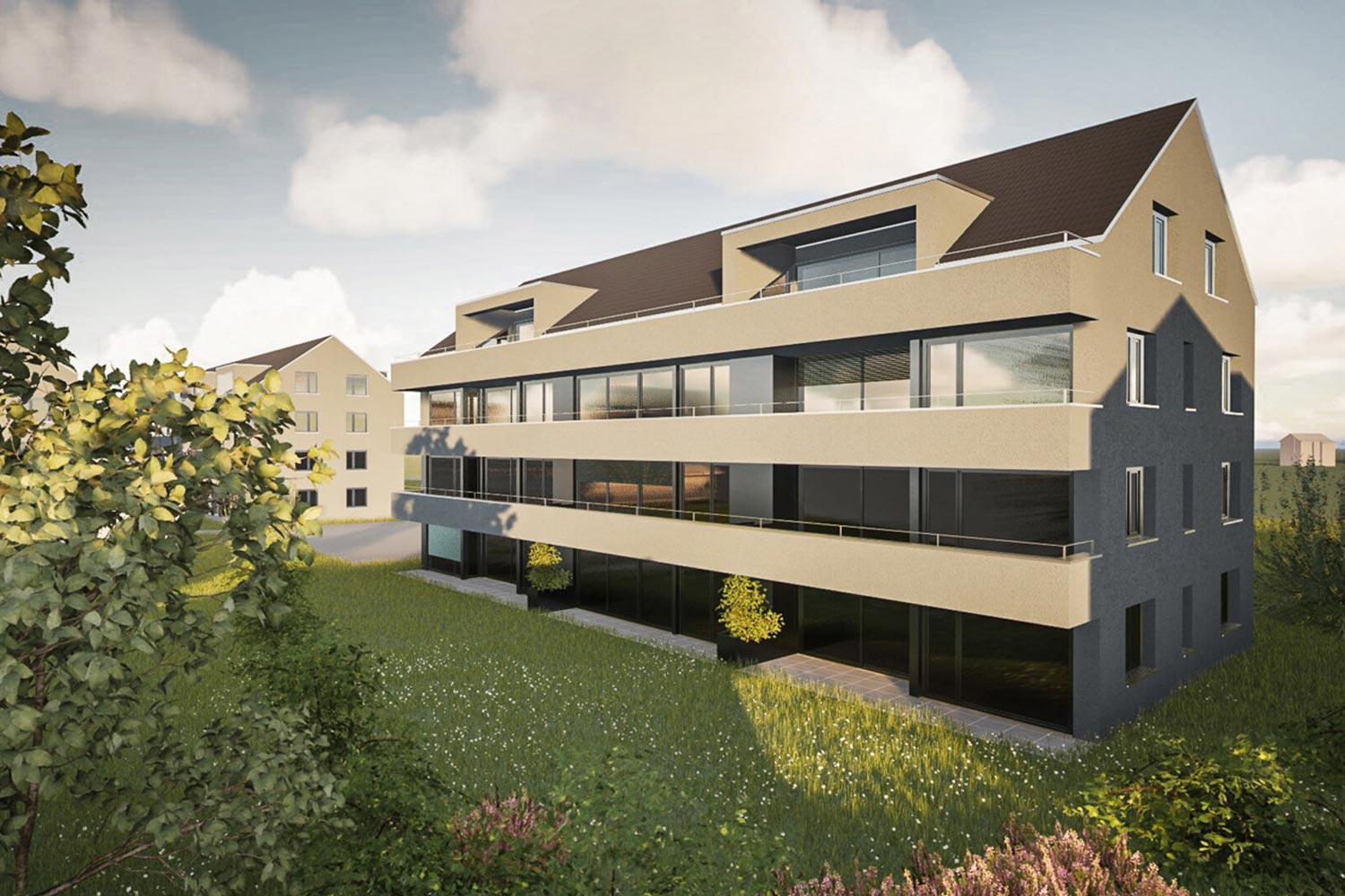 Das Ensemble aus drei Mehrfamilienhäusern mit insgesamt 42 Wohnungen verfolgt das Ziel einer qualitätsvollen Nachverdichtung im bestehenden Siedlungsgefüge. Die kompakt gehaltenen Baukörper sind in Ost-West-Richtung ausgerichtet. Eine durchgängige Balkonschicht auf der Ostseite strukturiert die Fassaden und bietet allen Wohnungen grosszügige, private Aussenräume mit Morgenlicht. Die gewählte Typologie mit Steildächern greift ortsbauliche Bezüge auf.