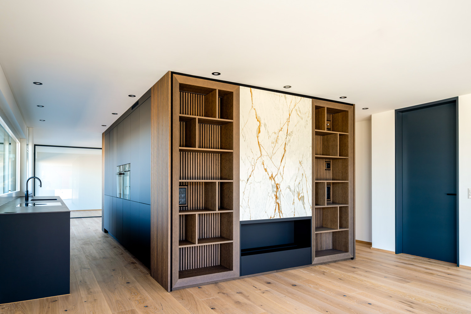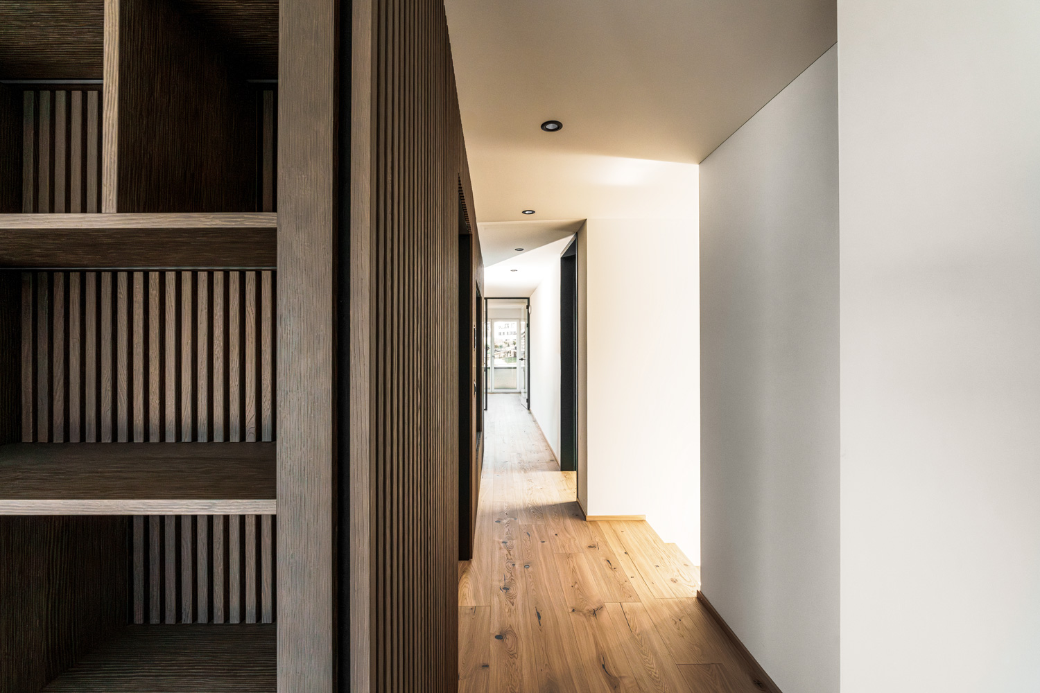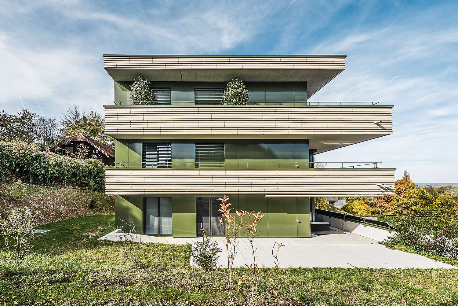 Das Mehrfamilienhaus mit fünf hochwertigen Wohneinheiten zeichnet sich durch eine horizontale Struktur aus, die eine klare Gliederung des Baukörpers ermöglicht. Die Fassade wird durch den Einsatz von Terracottaelementen geprägt, die dem Gebäude eine warme, natürliche Ausstrahlung verleiht. In Kombination mit grosszügigen Glasflächen entsteht ein lebendiges Spiel aus Offenheit und geschützter Privatsphäre.